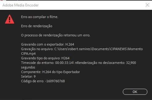Não consigo finalizar a exportação do meu projeto, sempre paparece uma mensagem de erro.