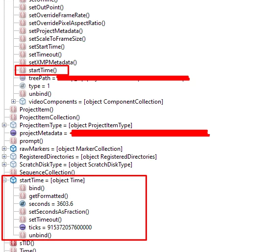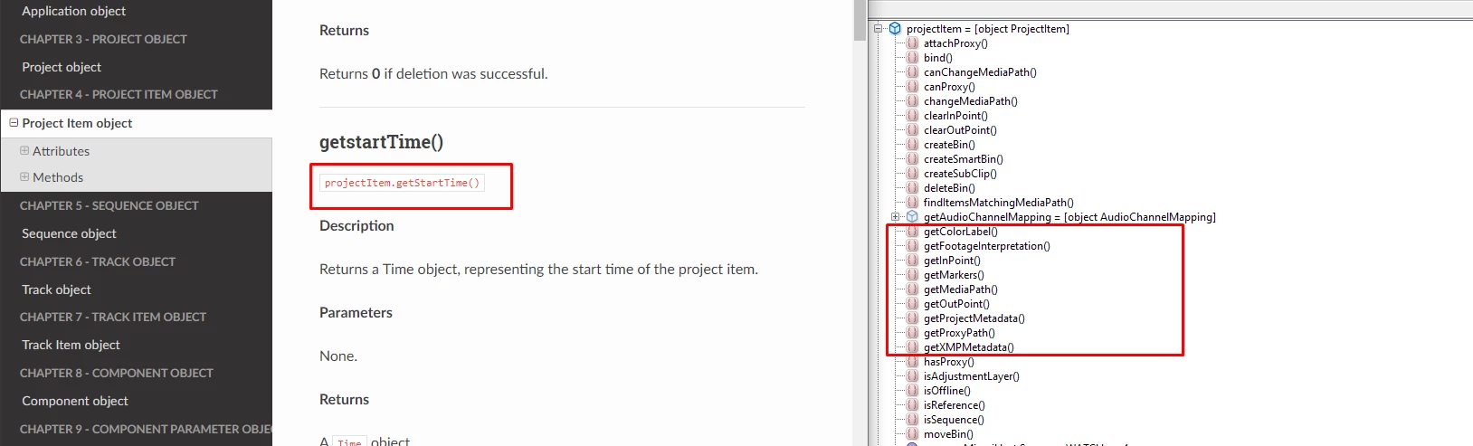 Premiere Pro Scripting Guide (https://premiere-scripting-guide.readthedocs.io/4%20-%20Project%20Item%20object/projectItem.html#) have error. Project Item haven't getStartTime() method