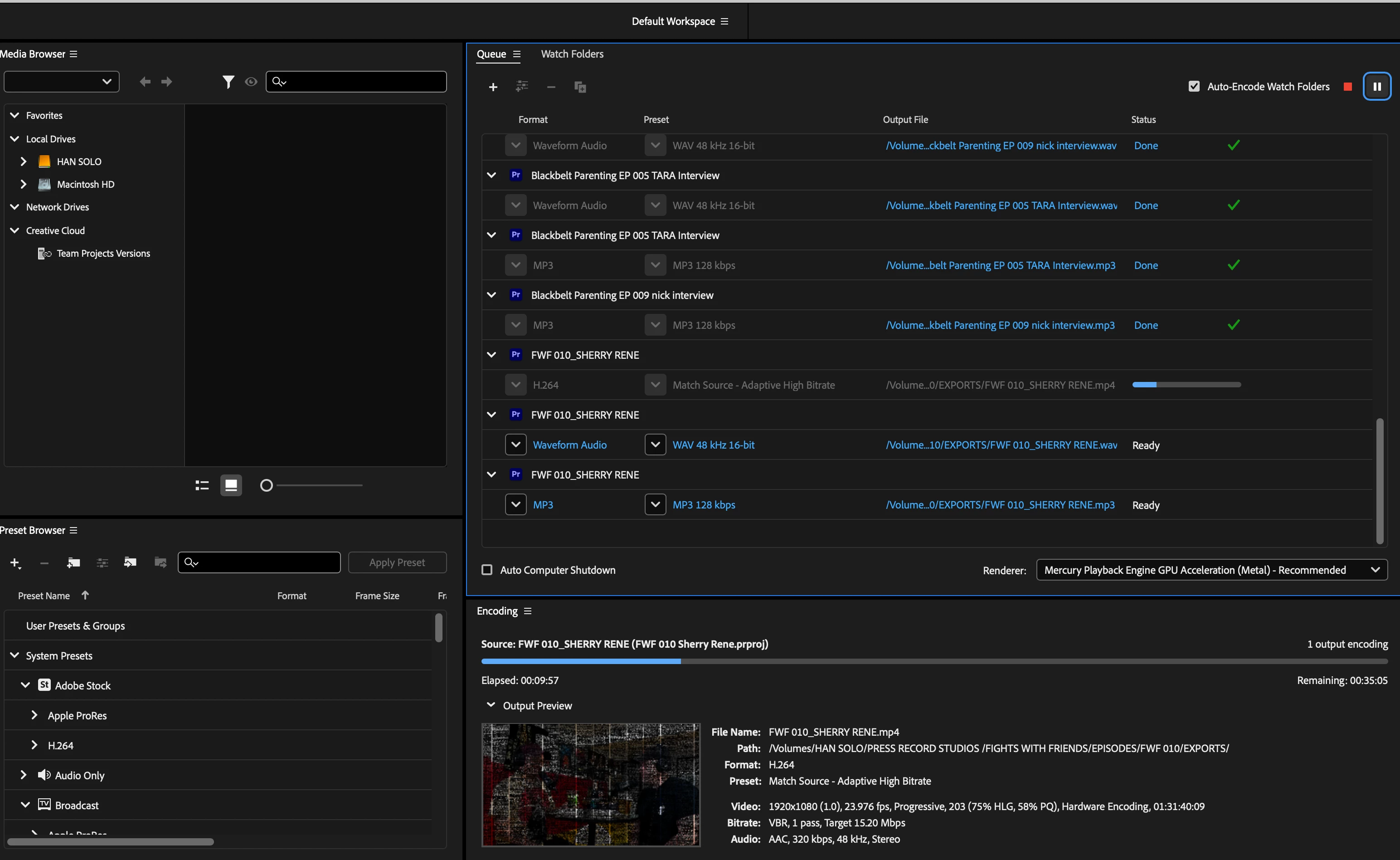 Anyone have problems with video files from Riverside? I normally have no issues, but I just updated my Mac's OS and did the recent Adobe update. After that, I have this problem when exporting - pics show it in Media Encoder where it exports chunks of the video like that. It also happened in my Premiere source monitor one time and another time in my program monitor, which happened while exporting through media encoder. Other files from cameras or camcorders or Zoom recordings have no issue, so it seems to be exclusive to Riverside. I tried converting the Riverside files into something else and replacing the footage, but still no difference. Any thoughts on what the issue is and what I can do to resolve it? Thanks