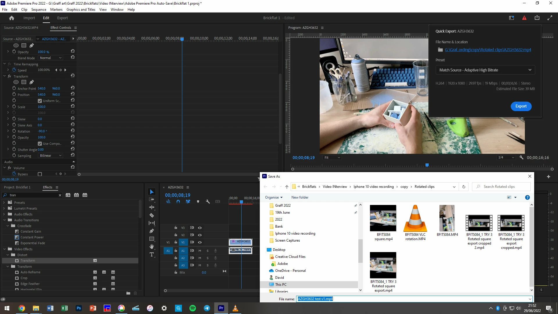 I rotated the source clip as described using transform effect, -90 degrees, producing a square image within a frame that appeared portrait in the program panel.