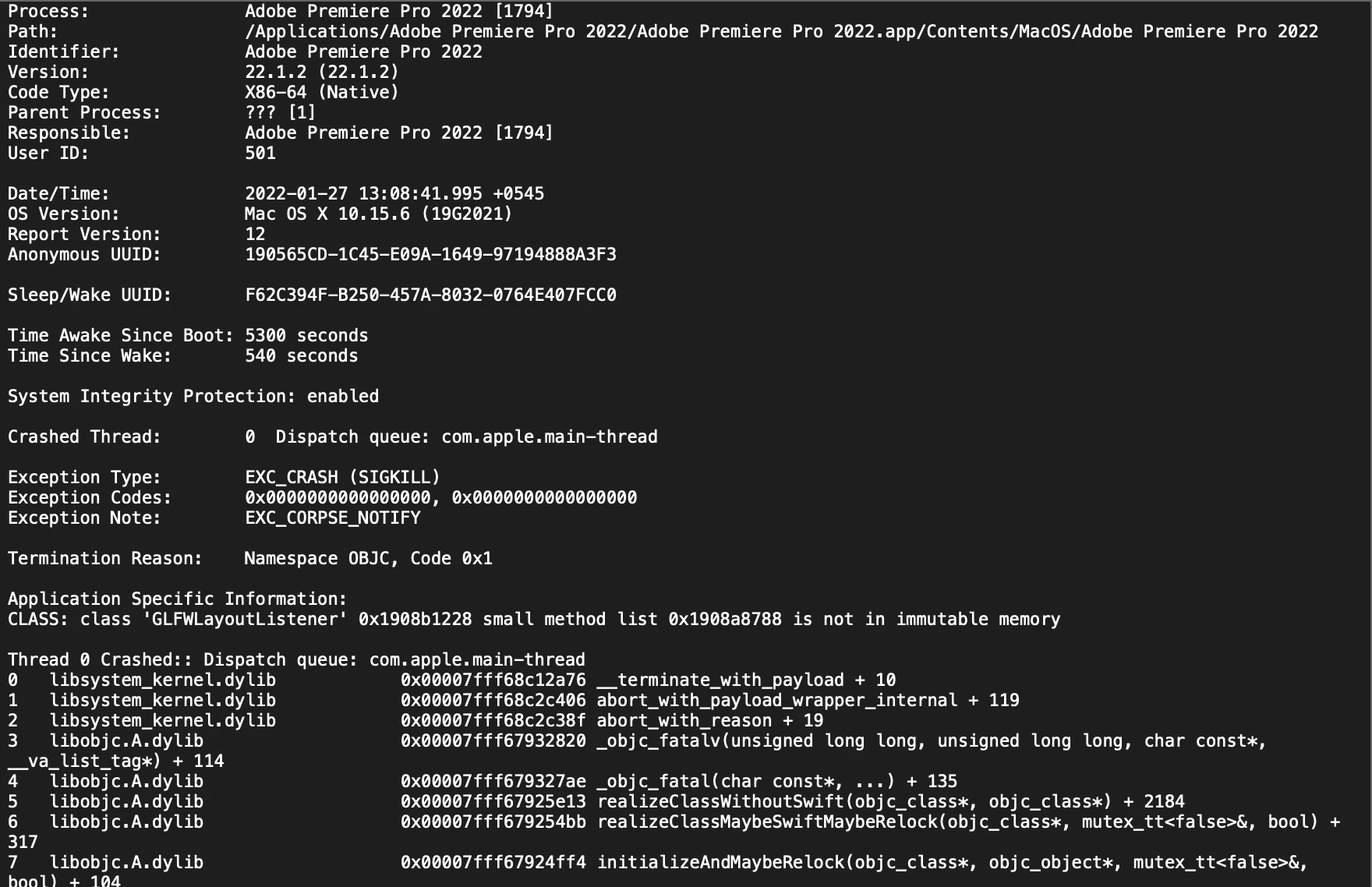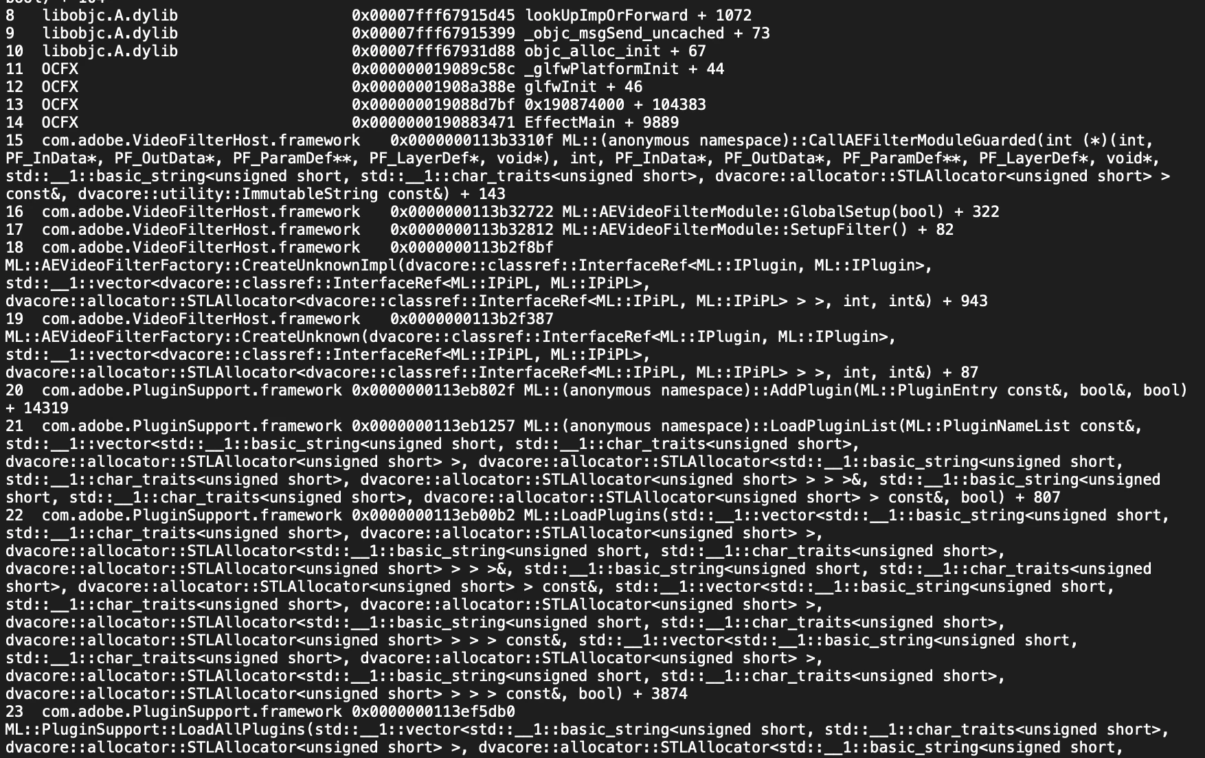 Excerpts from the crash log:
