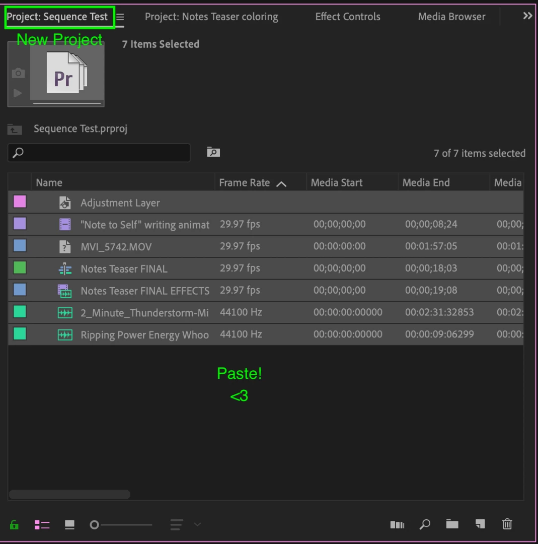 You can have more than one project open in Premiere, so let's create that new project and open the project with several sequences! Copy your one sequence over to the new project by selecting it, right-clicking, and selecting "Copy."