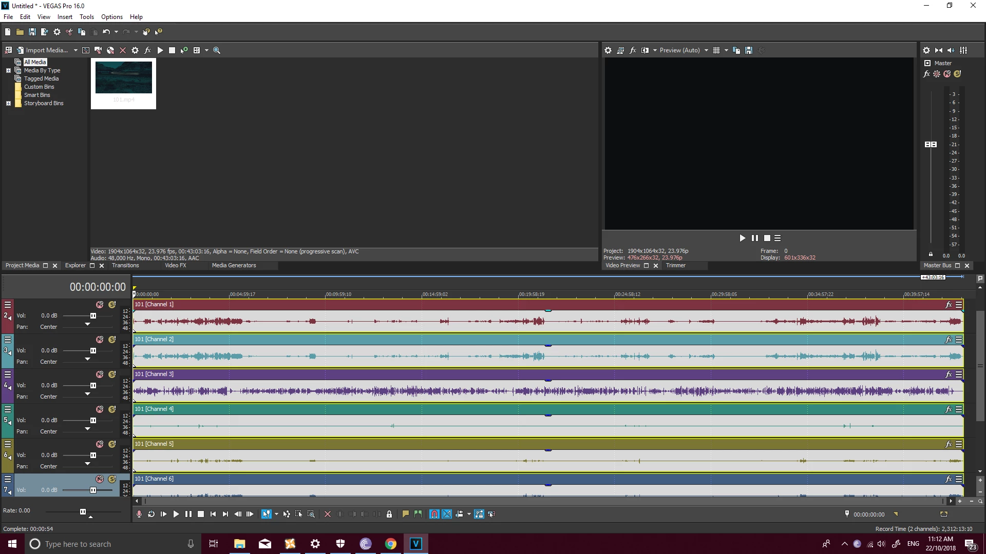 I have a six channel audio mp4 file. In Vegas, as soon as I plop it in the timeline, all six channels are very clearly visible and separate form each other, as shown in this screencap.