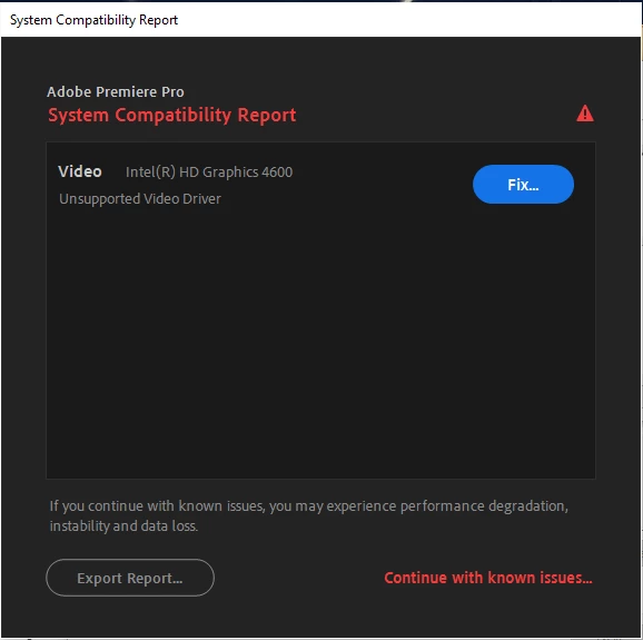 i recently bought a hp probook 640 G1 pc with an 8gm ram and a core i5 running on Windows 10 64bit, i installed premiere pro 2020 and whenever i launch the app it keeps showing me a system compatibility report which reads "unsupported video driver". My video driver is Intel(R) HD Graphics 4600, i upgraded it to version 20.19.15.5063 but it's still showing the compatibility report. I also tried installing the recommended driver from Adobe by clicking the "Fix it" button but while trying to install, it showed this error message "The folder doesn't contain a compatible software driver for your device". Please Help!