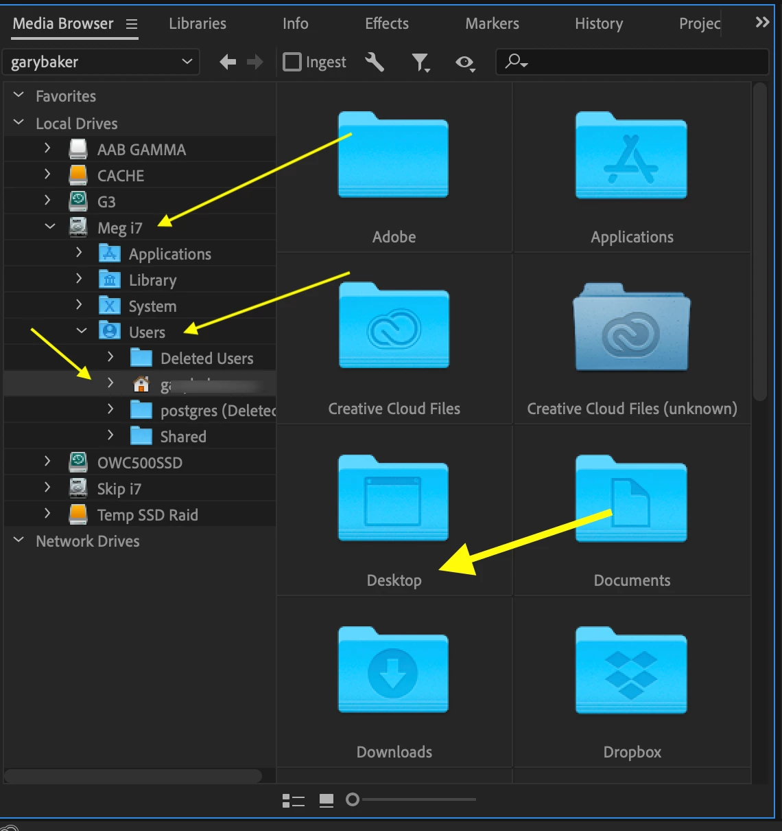 Just getting my feet wet with Premier Pro and have a simple question. I'm trying to import media files, both video and still images, and when I click on the Media Browser tab the window displays Favorites, Local Drives and Network Drives, with only the Local Drives containing content. When I open Local Drives, it shows Macintosh HD and my external drive, and inside the Macintosh HD folder appears the Applications, Library, System and Users folders. I can't find my desktop anywhere, which is where my files are stored. How can I access the desktop?