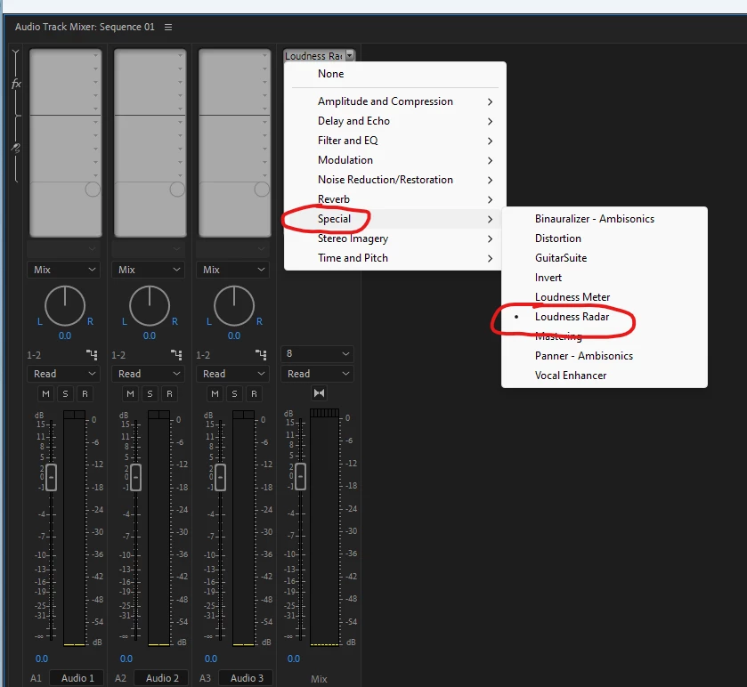 I need to work in a Multitrack Sequence to Output eight channels for broadcast and be able to do track routing. Now I like to work with the Loudness Meter effect as well. But I am afraid the Loudness Meter measures Loudness of all eight tracks. Can I set the effect to use only the first stereo pair of my eight tracks? Or do I need to create a submix and apply the effect there?