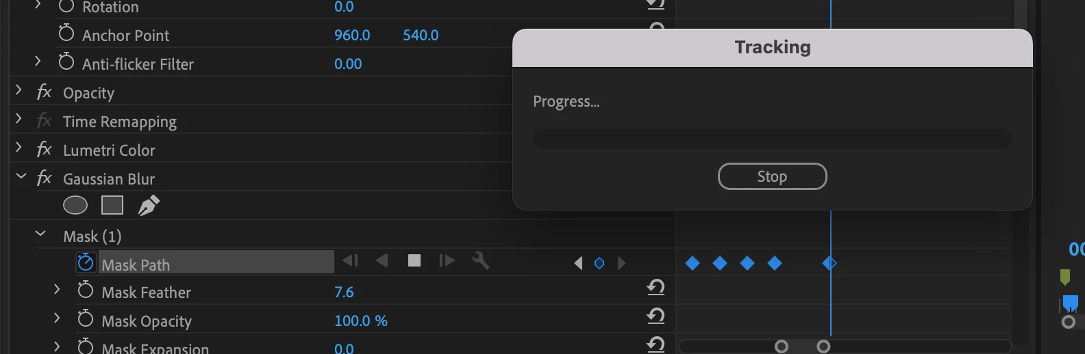I have attempted several times (after manually adding a few mask path keyframes) to use the mask path tracker function to speed up the proccess. after waiting a while (a few hours) the tracking window still shows no progress. I tried exiting and re-opening premier and restarting my laptop and it still wont work