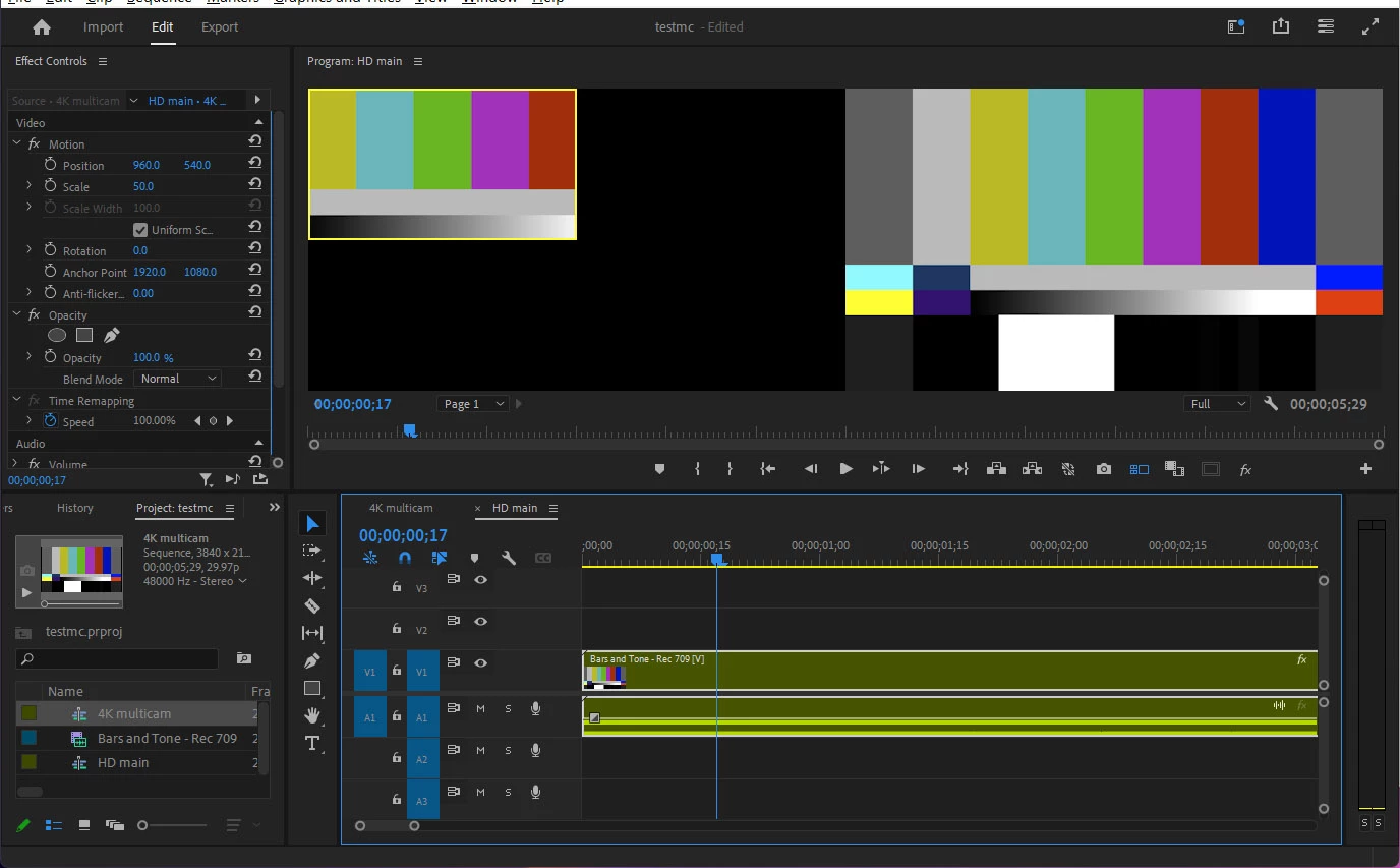 But when I use the 4-pane multicam preview, it shows only the non scaled version of the 4K sequence, so I only see a zoomed in version in the preview. In this example, the 4K multicam sequence only has 1 camera -- a 4k bars and tones. As you can see, the preview is a zoomed/cropped version of the actual view.