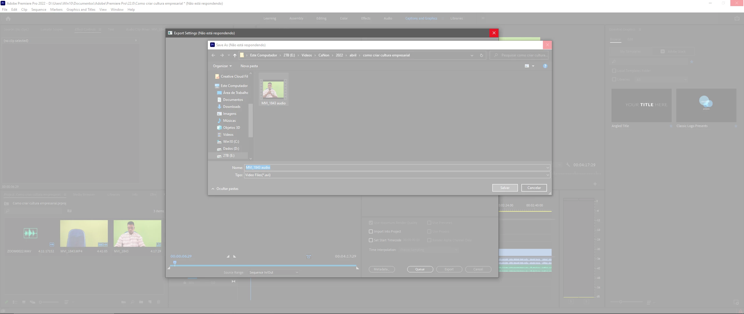 AS MUCH AS THE PREMIERE AND THE AUDITION ARE STOP RESPONDING FREQUENTLY, WHEN IMPORTING A FILE, OR TRYING TO SAVE THE SAME, BEFORE IT DIDN'T HAPPEN I USED THE 2020 VERSION AFTER IT STARTED HAVING PROBLEM AND THE 2022 ALSO, IT IS NOT WORKING WITH THE PROGRAM STOPPING WORKING ALL THE TIME