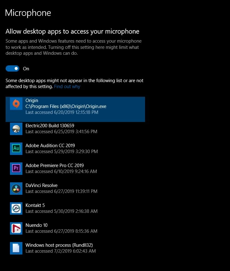 The additionnal switch for microphone access for desktop apps is now present and on.