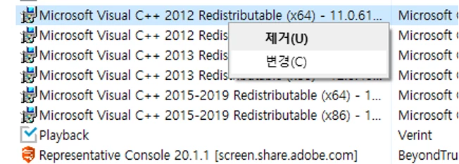 “ Microsoft Visual C++” 중 컴퓨터와 CD 모양의 아이콘을 마우스 우측 클릭 진행 하여 변경을 눌러 줍니다.