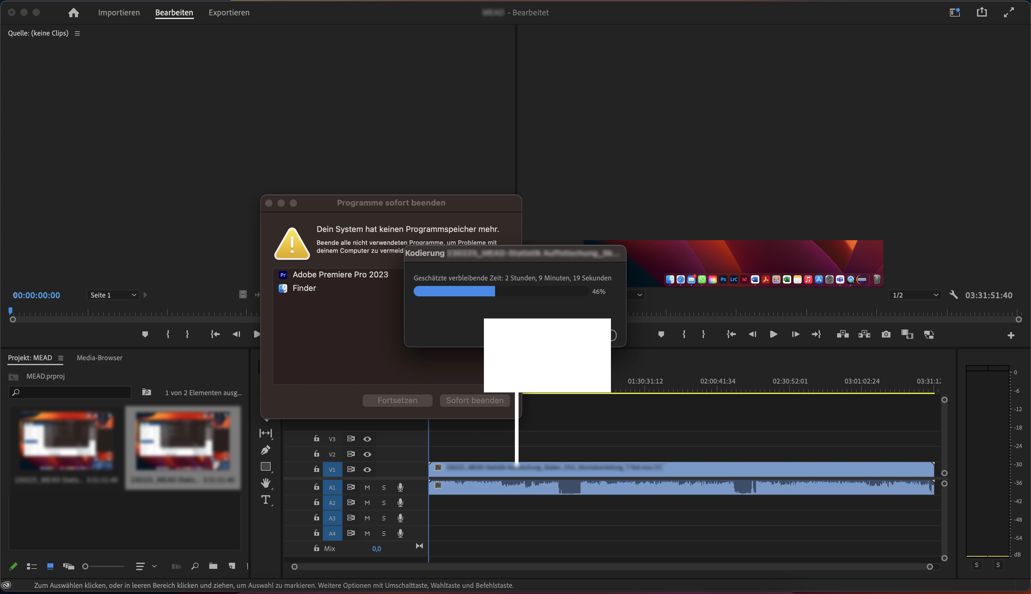 Das Problem ist, dass Premiere 2023 und ältere Versionen (Version 23.2.0 - Build 69) nicht fertig rendert, sonder das Programm einfriert/abstürzt und folgende Fehlermeldung aufpoppt: "Dein System hat keinen Programmspeicher mehr". Beim Rendern habe ich immer alle Programme geschlossen.