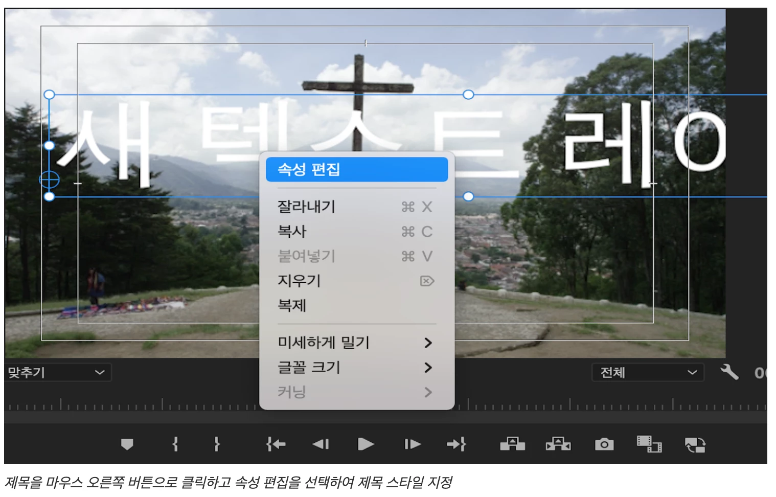 제목과 그래픽 스타일을 지정하는 디자인 도구에 빠르게 액세스합니다. 이제 프로그램 모니터에서 텍스트 또는 모양 레이어를 마우스 오른쪽 버튼으로 클릭하고 컨텍스트 메뉴에서 속성 편집을 선택하여 그래픽 패널을 열 수 있습니다. 글꼴, 색상 및 스타일 옵션을 사용하여 제목을 사용자 정의할 수 있습니다.