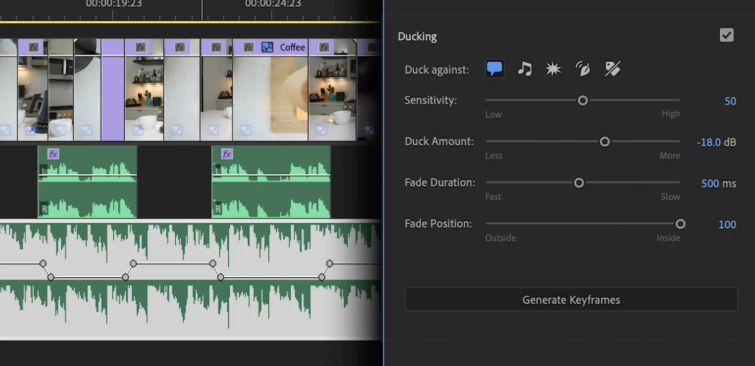 자동 더킹은 대화가 있을 때 사운드 트랙이나 기타 배경 오디오의 볼륨을 줄여 더 쉽게 들을 수 있도록 해줍니다. 이제 새로운 페이드 위치 슬라이더를 사용하면 원하는 결과를 빠르고 쉽게 얻을 수 있습니다.