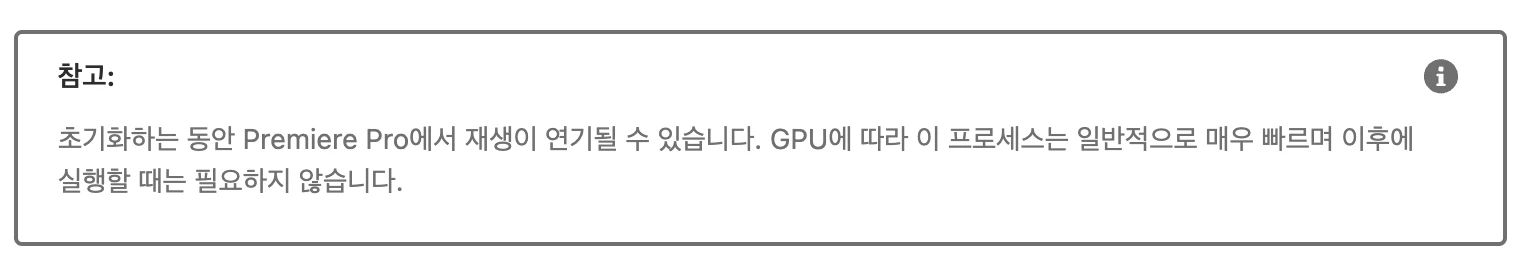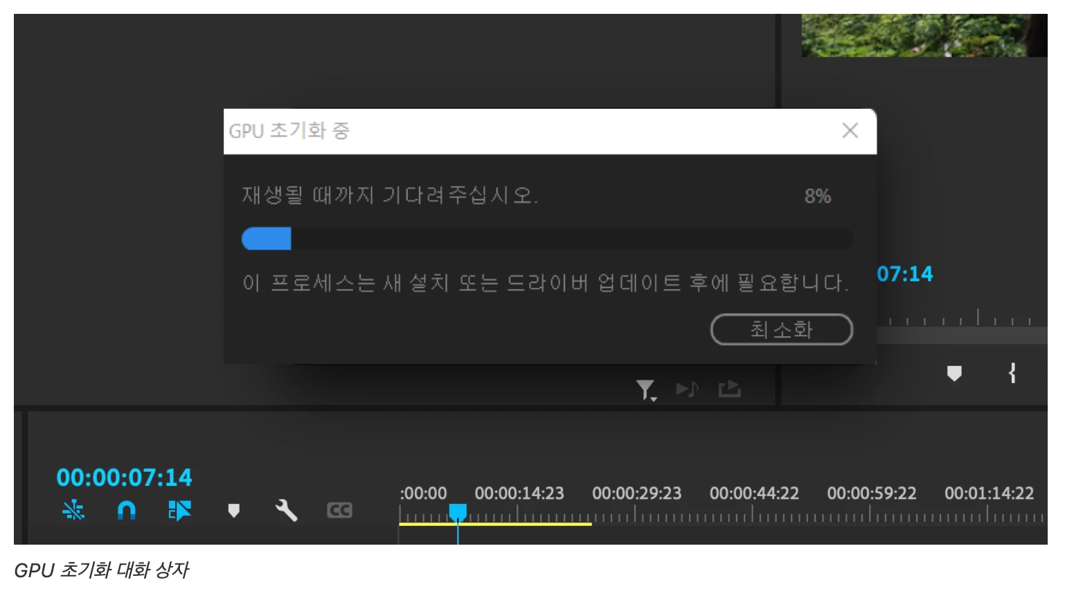 새로운 설치 또는 드라이버 업데이트 후 처음 실행할 때는 Premiere Pro에서 GPU를 초기화해야 합니다. 문제가 발생하면 새로운 진행 표시줄이 표시됩니다.