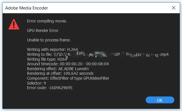 A project of mine is suddenly showing this error message when I export media with Lumetri Color adjustments applied: