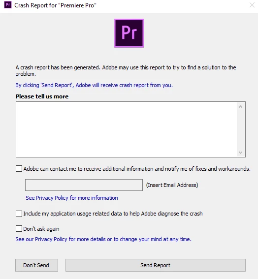 Whenever I try and launch Premiere it boots opens the logo screen (1) and it doesn't display text and then crashes and displays a crash report (2). My PC specs are: