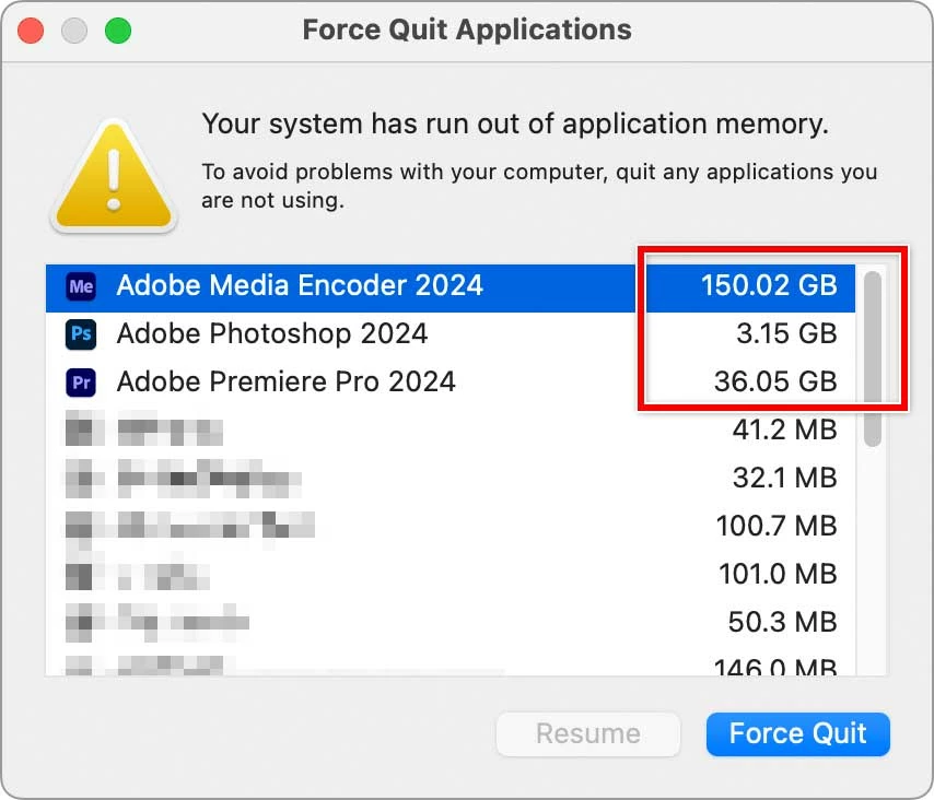 As far as what you call the "bug problem," there is no guarantee that a similar problem won’t happen again because if it’s really a bug, it can still cause a bad memory leak exceeding what your Mac has. In the example I mentioned earlier from almost a year ago (so it probably doesn’t apply to the current version), macOS reported that during an edit/render session, Premiere Pro and Media Encoder eventually ended up asking for more than 180GB of memory on my 32GB Mac and it was causing the system to lock up. I was sending Media Encoder projects that were simple cuts-only edits with almost nothing on other tracks, no effects, no plug-ins, and less than 5 minutes each (they were software tutorials, just screen recordings, nothing fancy). I concluded this had to be somebody’s bug due to the extremely simple nature of the projects, and because Premiere Pro memory usage for me is often under 10GB. I posted about it here back then, and I never did find out if it was a bug in macOS memory allocation or Premiere Pro, but obviously there was a memory leak bug somewhere because in no way could this be “expected behavior” for such simple projects. Below is a screen shot of that situation a year ago.