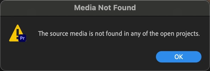 In Premiere Pro 24.3.0 (Build 59) on a MacBook Pro 2023 M2 Max (macOS 14.5), I have a Production with two projects, "Cuts" and "Footage". In one of the sequences in my "Cuts" project, there are clips from a video file that play back, but when I try to "Reveal in Project", it says:
