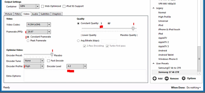 If you can't get a transcoded version from your mate ... take the files into Handbrake, and set up a preset that 1) maintains frame-size, (picture tab) and 2) is set to convert at a high level and at near placebo-settings so it doesn't compress the file more than minimally. The following graphic is the video tab of a setting I use to convert my phone media to CFR, just set the frame-rate to the same number as the source files and the Level and other settings as shown here ...