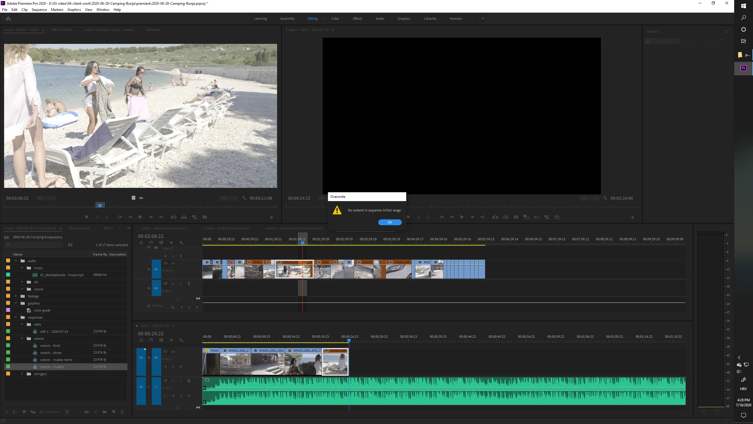 all of a sudden I started getting a weird error in Premiere. When I try to do an insert/overwrite edit, either by pressing the dot key on my keyboard "." OR dragging the little film-strip icon under the image in Source mnitor, this message pops up: "No content in sequence In/Out range".