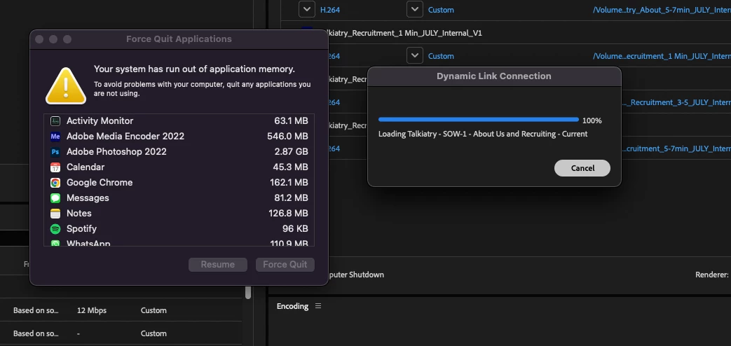 My brand new Mac Studio is having issues when I run Premiere Pro and Media Encoder at the same time. Premiere Pro quits on me, and I'm prompted with Force Quit and the message, "Your system has run out of application memory. "To avoid problems with your computer, quit any applications you are not using."