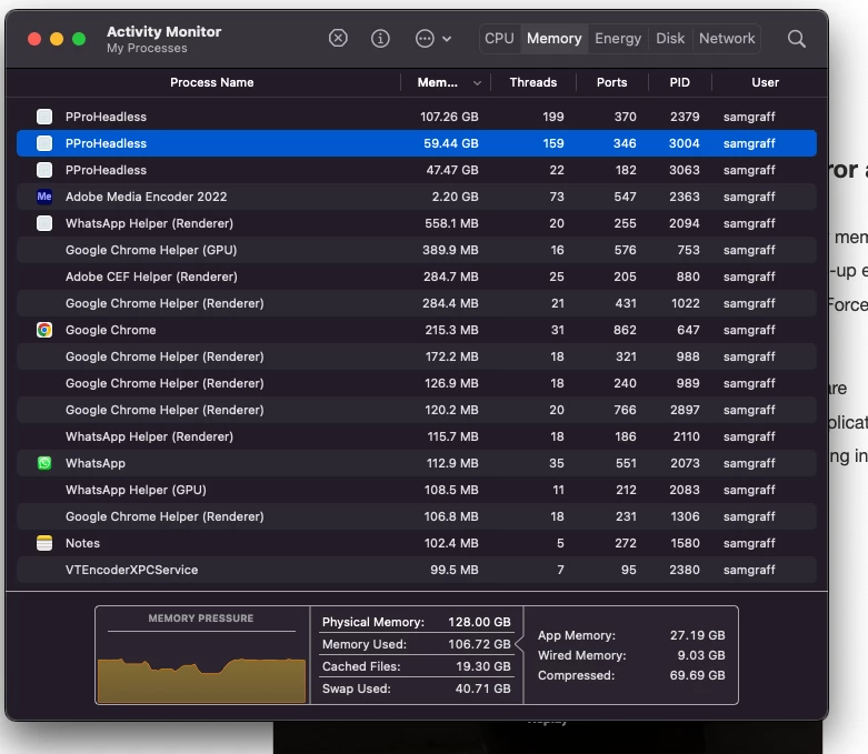 I opened activity monitor and saw that "PproHeadless" is open and running twice, and using 107 GB and also 58 GB. What is it??? It's clearly a part of premiere (Applications/Adobe Premiere Pro 2022/Adobe Premiere Pro 2022.app/Contents/PProHeadless.app/Contents/MacOS/PProHeadless), but why is it taking up so much memory?? I never had any issues like this with my 2013 Mac Pro tower, and I was JUST editing the same project on that computer before this one arrived.