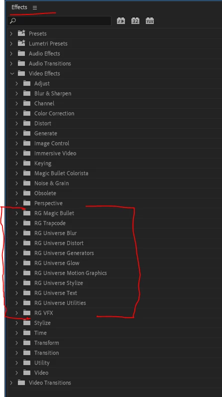 Here's what my Effects panel looks like when I twirl down the Video effects tab ... see where all my Red Giant Universe effects are located?