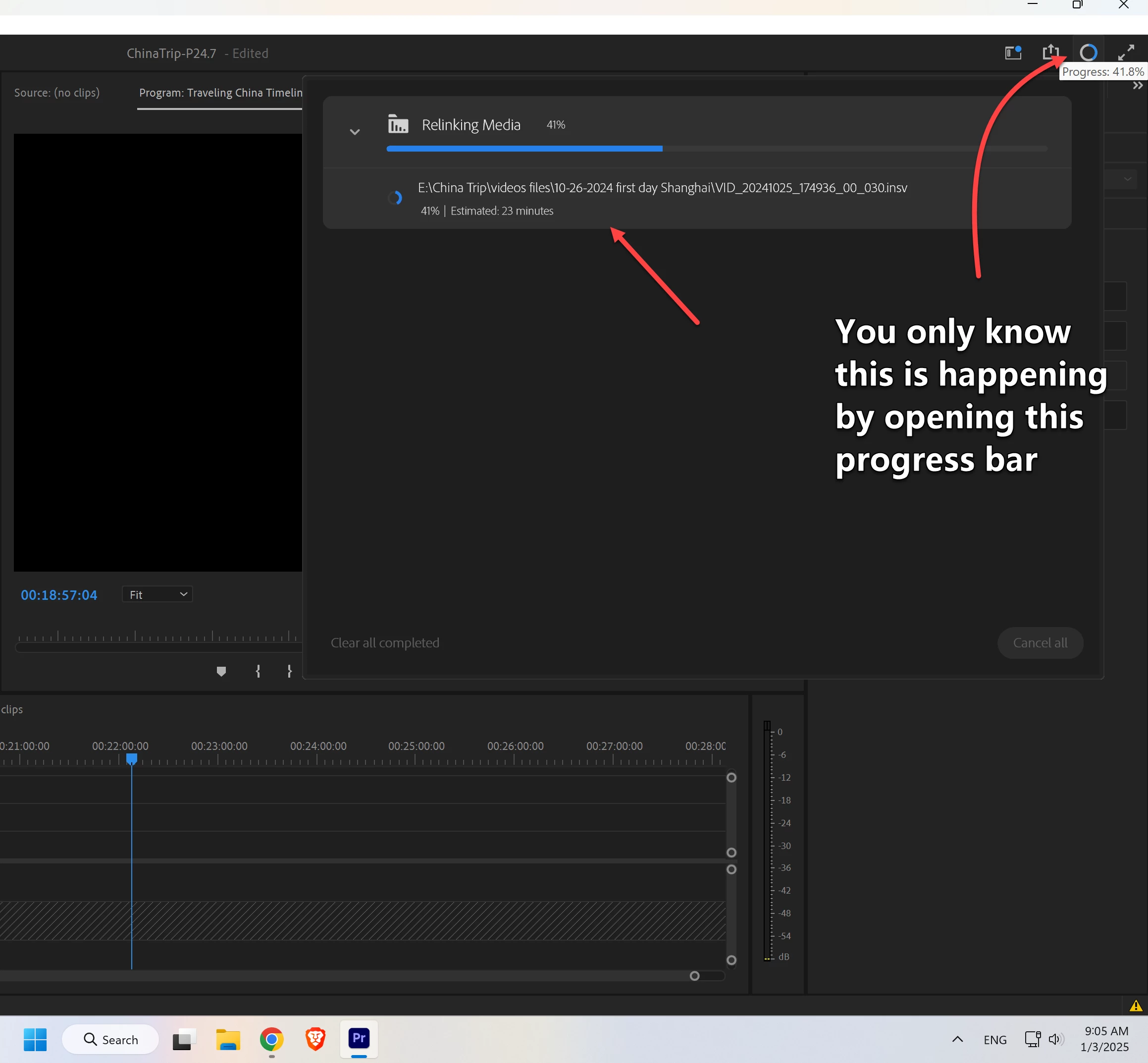 I recently moved all my media to a different drive on the same computer. I got the relink dialog pop up box as I expected and after linking the first one premiere automatically found the others as expected. The project opened normally and I thought everything was fine. However, I saved the project and closed it. Later I reopened the project and noticed a progress bar in the upper right corner and premiere was barely useable/nearly frozen while this progress bar was going. I opened it and it says "relinking media." THIS IS NOT THE SAME AS THE POP UP relink media box. There are probably a hundred or more clips and this takes about 40 minutes to an hour for this to finish every time I open the project.