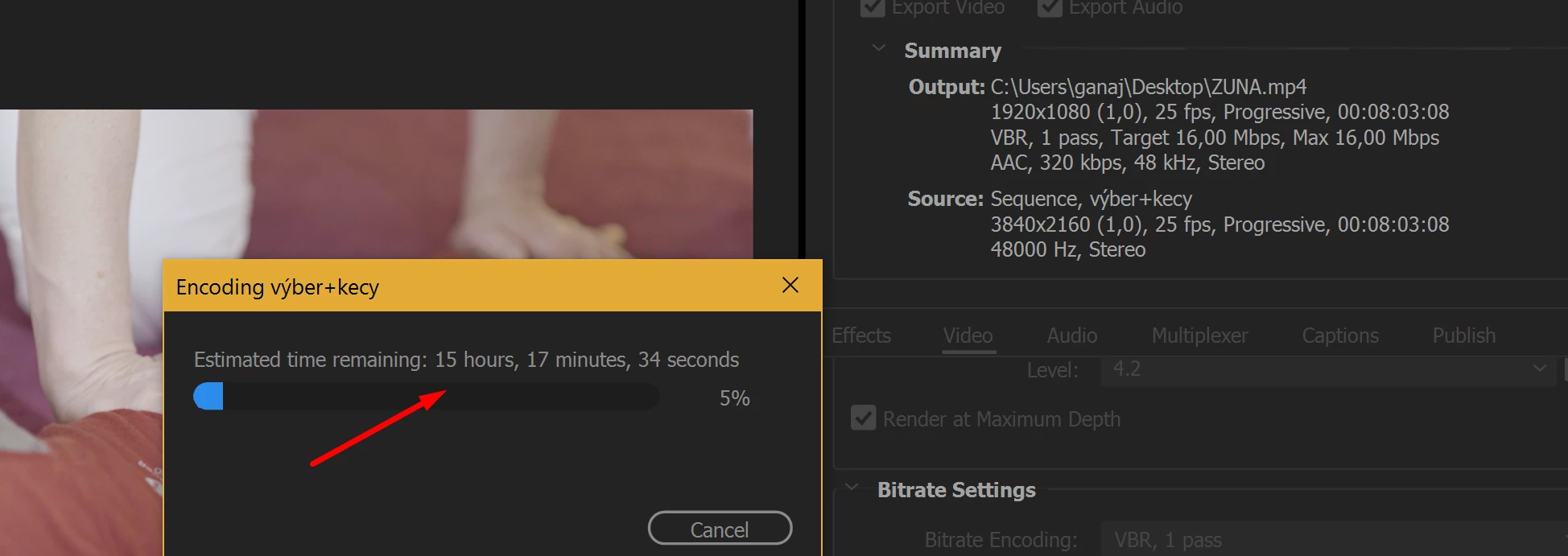 Hi, I am using Pr CC 2017. Yesterday I was exporting an 8 minutes long clip. I don´t know how is that possible, Pr told me, that I have to wait 15 hours for export. But I was waiting probably for 27 hours. Usally I am rendering 70-130 minutes videos and it took about 45-55 minutes to render them. Do someone know what is the problem?