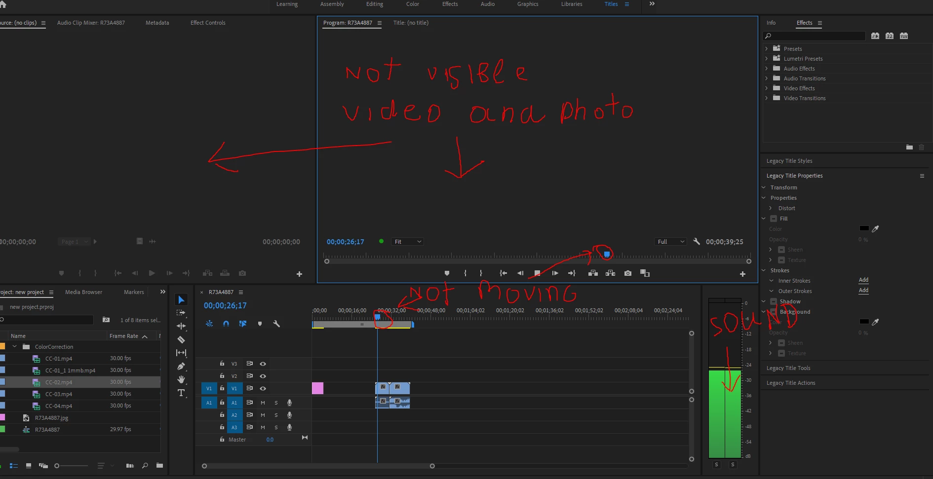 Then import new photo or video, and put it on timeline, but not see picture om main screen. When I press play, if it is video I hear sound but not see video (change renderer doesn't help) also when I press play, slider not moving, but I hear sound so he should move...