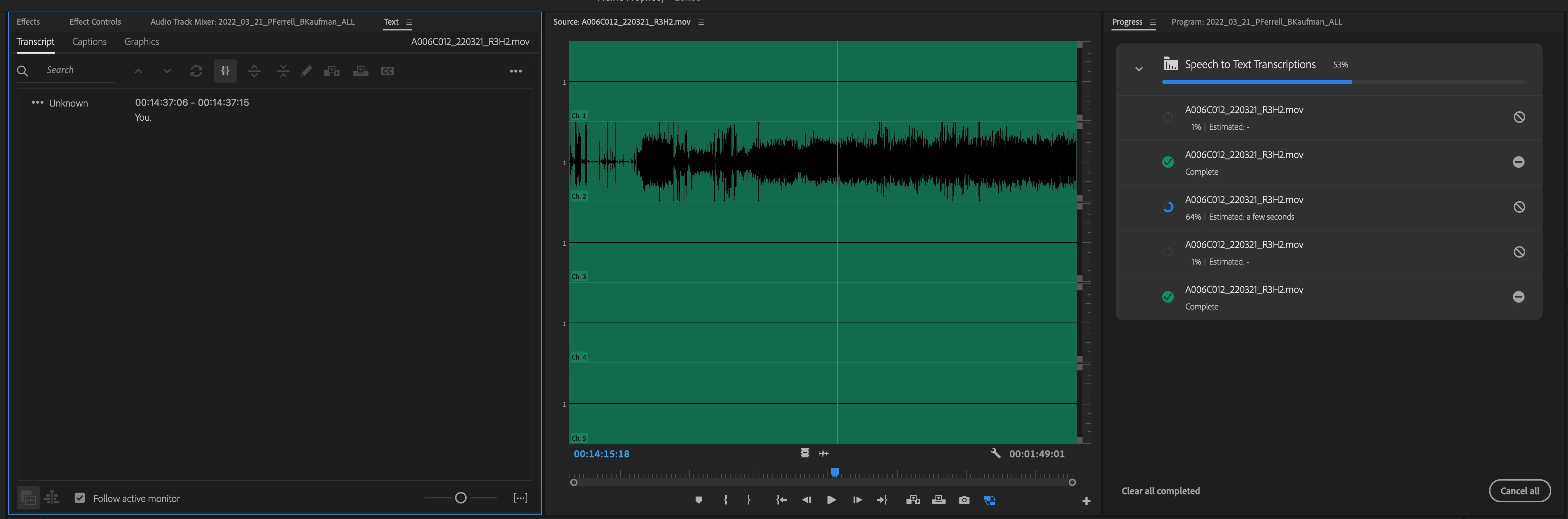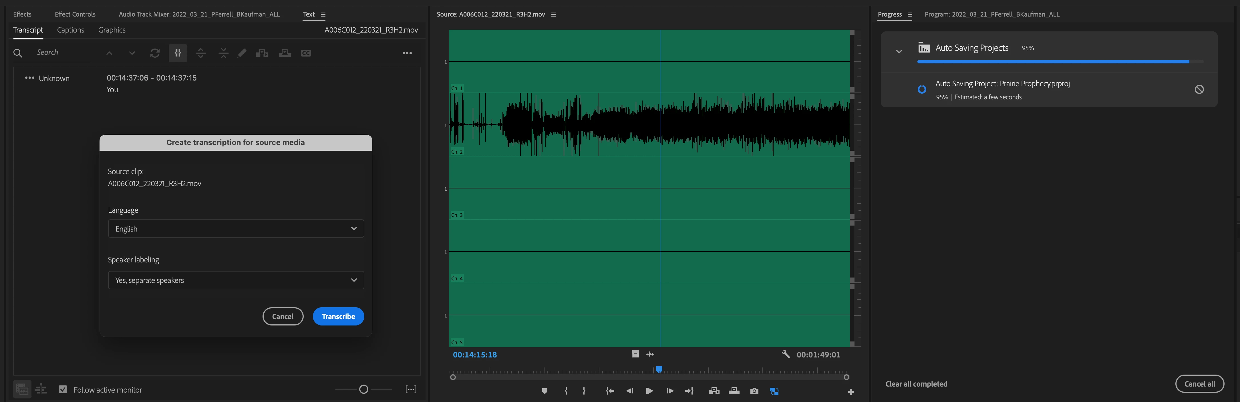 Seems to be throwing the trascribe completely outta whack. Only workaround was to export a stereo clip of my multi-channel audio file and replace source footage with the newly created audio.