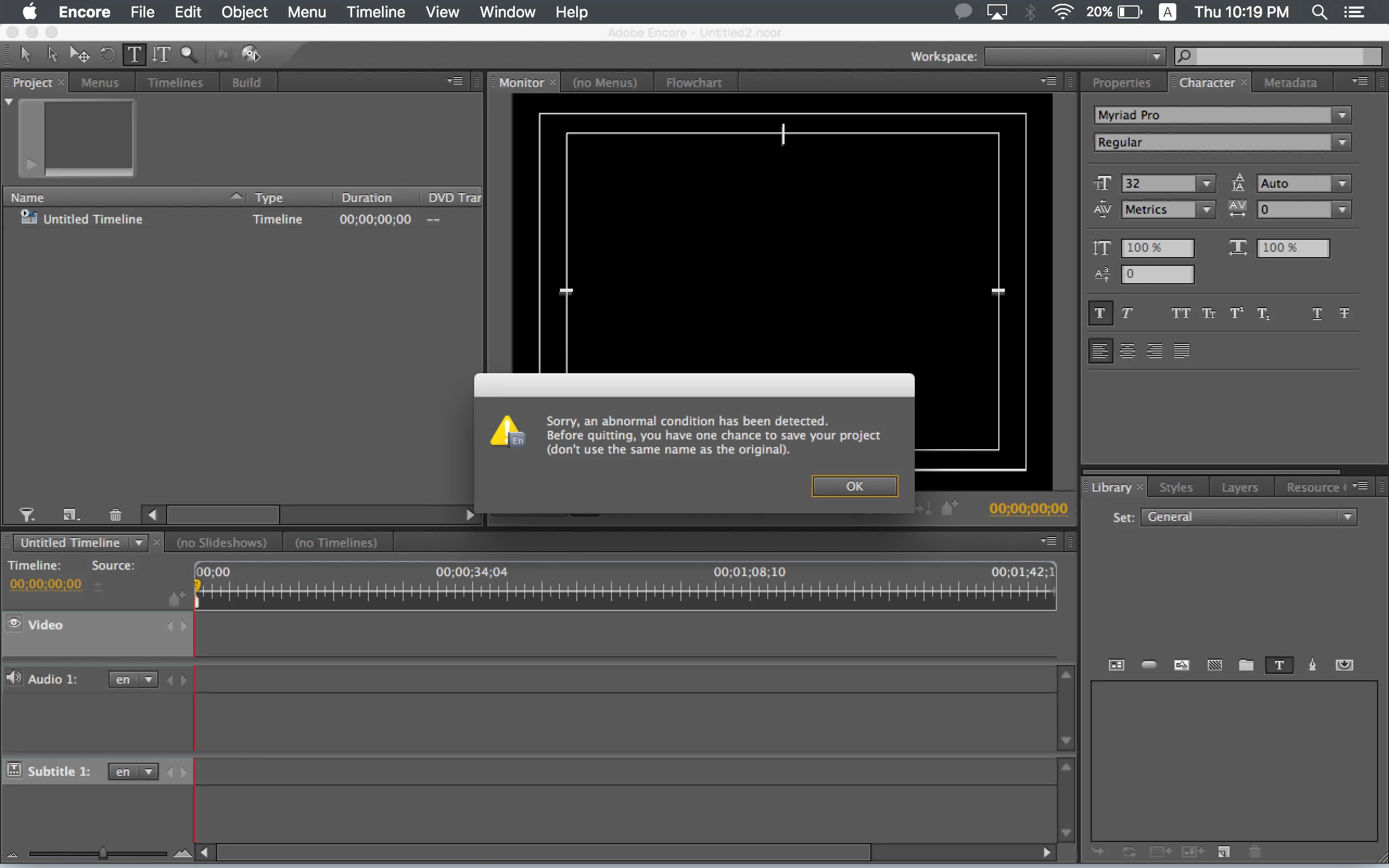 My main purpose is to add subtitle into encore. After trying several srt converted to encore.txt format and nothing works, I resorted to manually type it in the subtitle track. Then this happens: