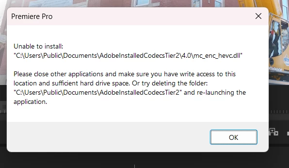 I am having a huge issue with Adobe Premiere Pro in which I can't export/render and sometimes even preview files that need HEVC decoding/encoding. I get an error stating that:
