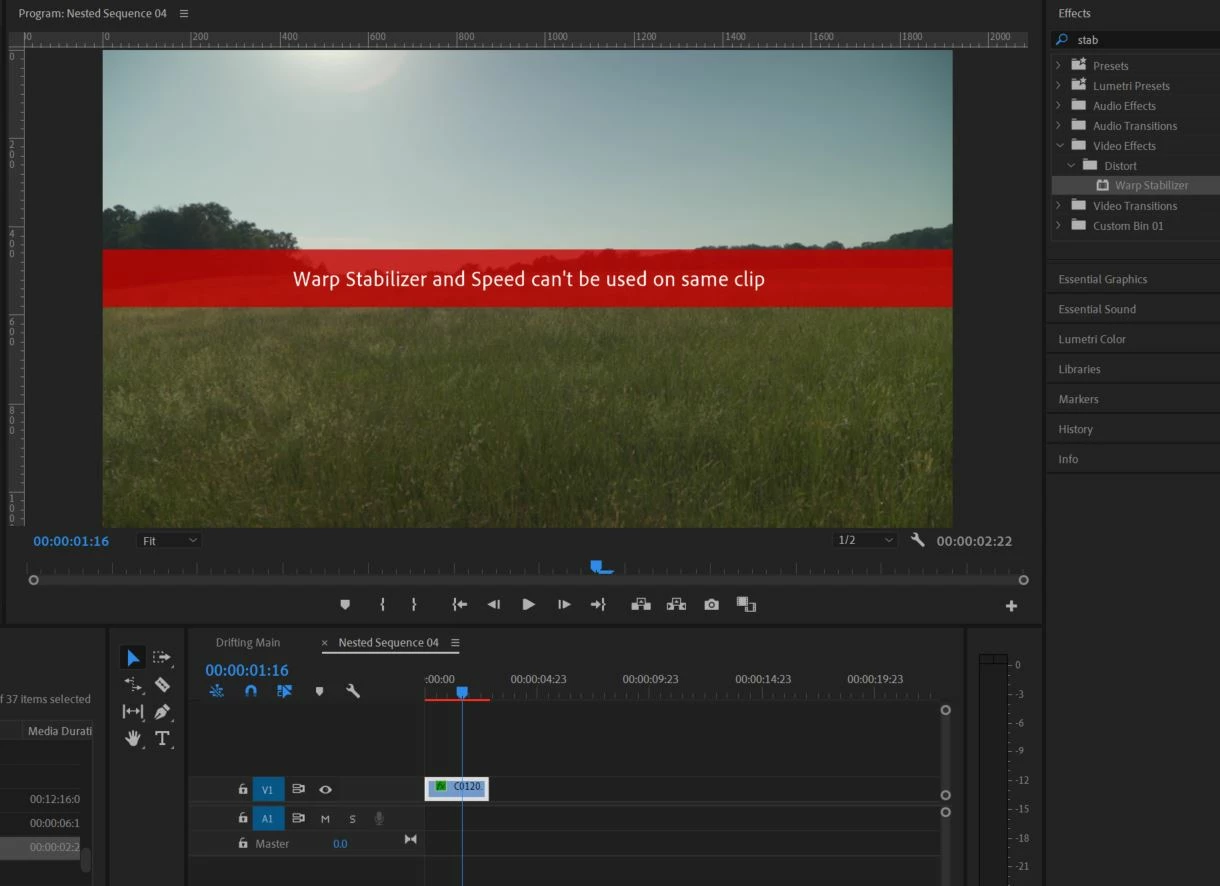 I am unable to use the warp stabilizer effect along with the time remapping/speed adjustment, even after nesting the clip.