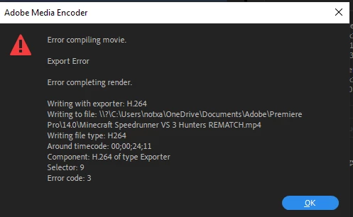 I just exported a video hours before the issue came up. When I export the video, it will load an ETA window, freeze after a few seconds, black screens completely, (ctrl + alt + del nor alt + tab works.) then closes the application. Other times, it will just black screen forever, requiring a restart of the computer to get it working again. Solutions would be very much appreciated. Picture of the error message is located above. Keep in mind I have tried deleting the problematic section times, updated Premiere Pro, restarted my computer, reset my computer, redownloaded Windows 10 again, and disabled GPU rendering.