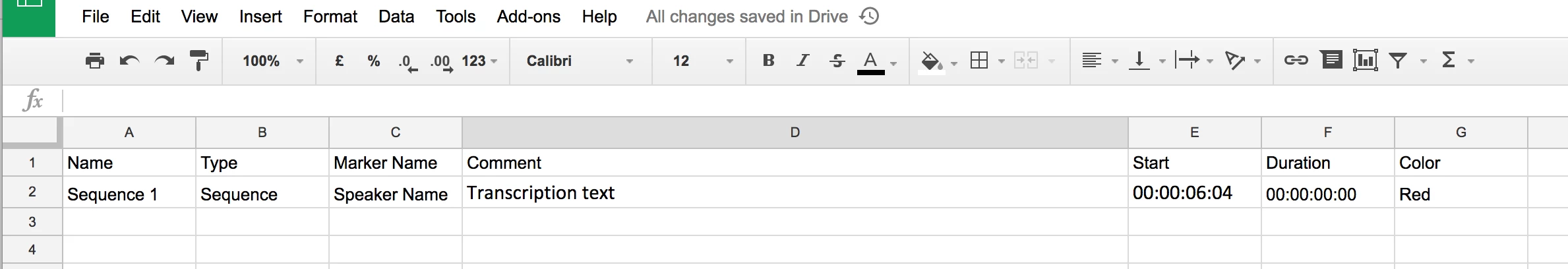 4. Open a Google Drive Spreadsheet with the following columns: Name, Type, Marker Name, Comment, Start, Duration, Color.