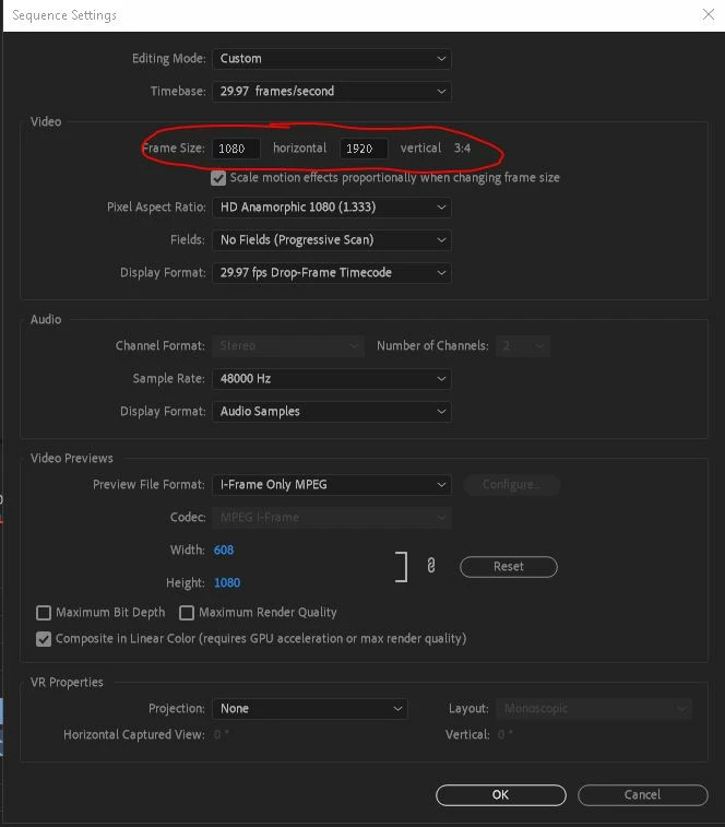When I enter in the frame size to change the sequence settings of my video, Premiere Pro is incorrectly saying that it's a certain aspect ratio. For example, if I enter in 1080:1920, it should say that it's 9:16, but instead Premiere Pro thinks that it's 3:4 and crops it that way.