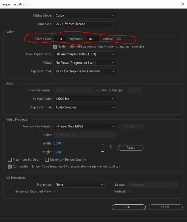 Or if I say that the frame size is 1080:1080, it should be a 1:1 ratio, but Premiere Pro says that it's 4:3 and crops my sequence accordingly as a rectangle instead of as a square.