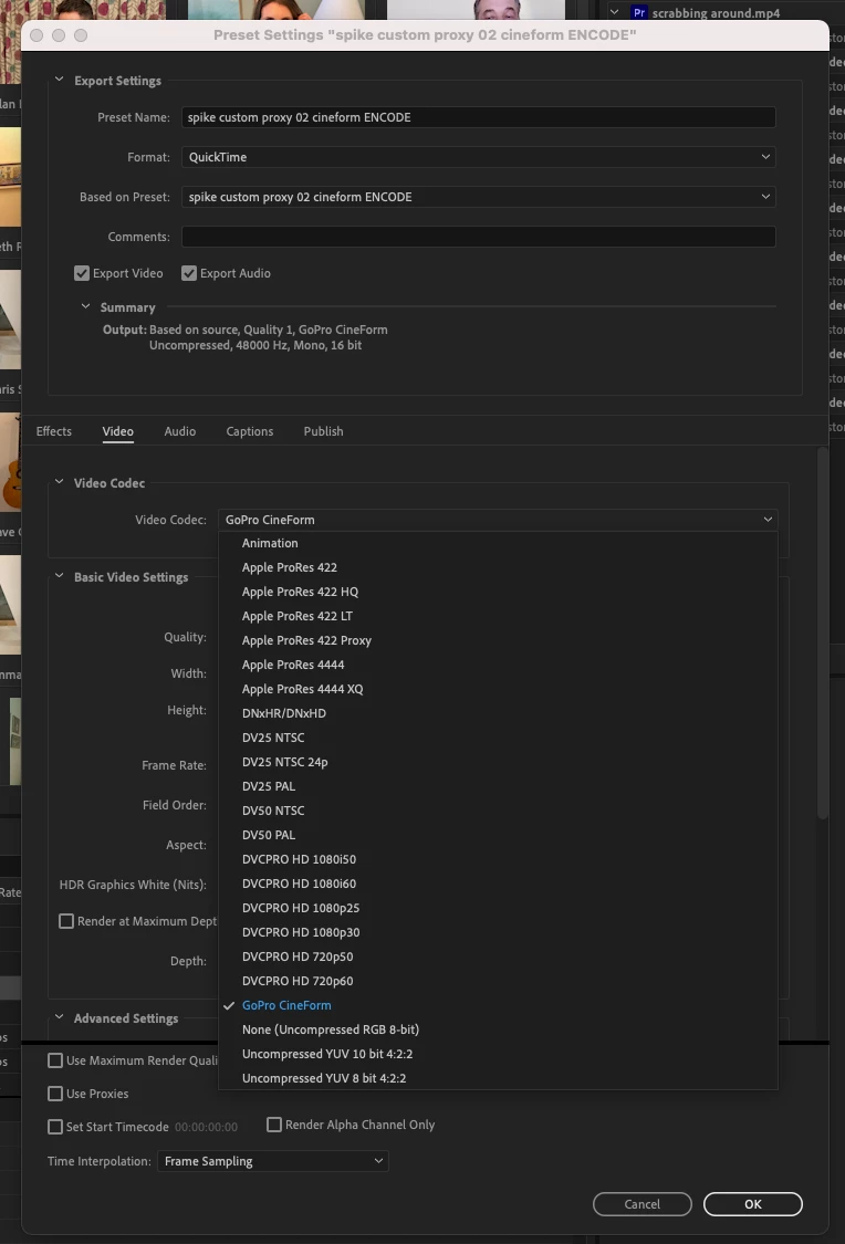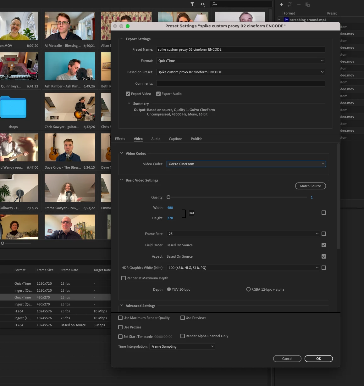 - My final attempt was Quicktime GoPro Cineform (see screenshots) at 480 x 270 - filesizes were comparable to the originals
