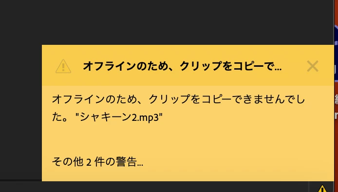 「その他2件の警告」の内容次第なのですが、もしコピーに失敗するファイルが特定のMP3ファイルだけでしたら、そのファイルだけあとから手動でコピーしていただくといかがでしょうか。この方法をとる場合、プロジェクトマネージャーで作成されたプロジェクトでうまくリンクできるか否か念のため確認していただければと思います(理想的には、別のパソコンが望ましいです。編集作業を外付けストレージでの編集を行われてましたら、そのストレージを外してから確認という方法でも良いと思います。)。