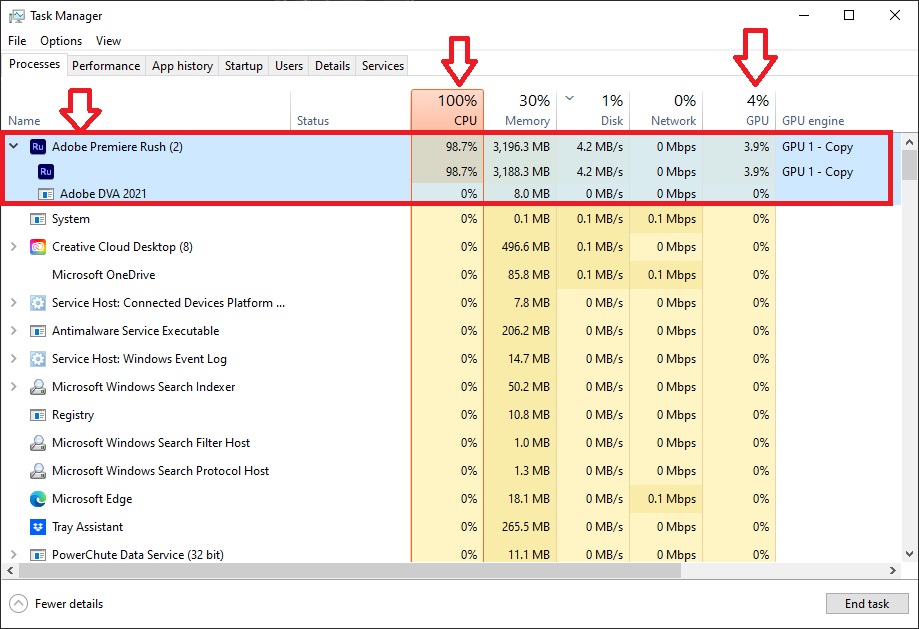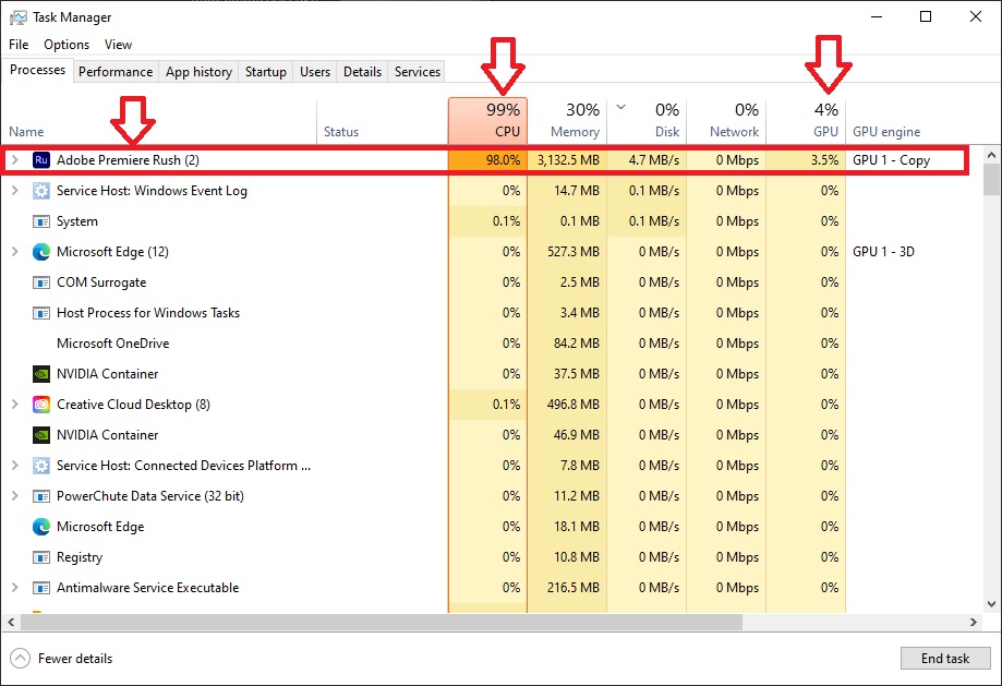 I am having the same issue, these settings did not fix it. The problem is that my GPU is not being utilized more than 3 or 4 % while the CPU is being utilized 100% (see attached image). Ive been using Premium Rush for years on this same PC with no changes, even yesterday it ran the GPU at much higher utilization and today the GPU is not being utilized. Videos are taking an hour to render where as yesterday the same video would render in 2 or 3 minutes. I have verified that my hardware acceleration settings match what you have suggested in your response (see attached image), and still no change. I have verified all my drivers are up to date and Premium Rush is up to date. I even uninstlaled Premium Rush and re-installed it. Ive rebooted my PC. I have de-selected the hardware acceleration setting, and re-selected it to see if the change made a difference. No different still having this issue. Please advise, this is hurting producivity.