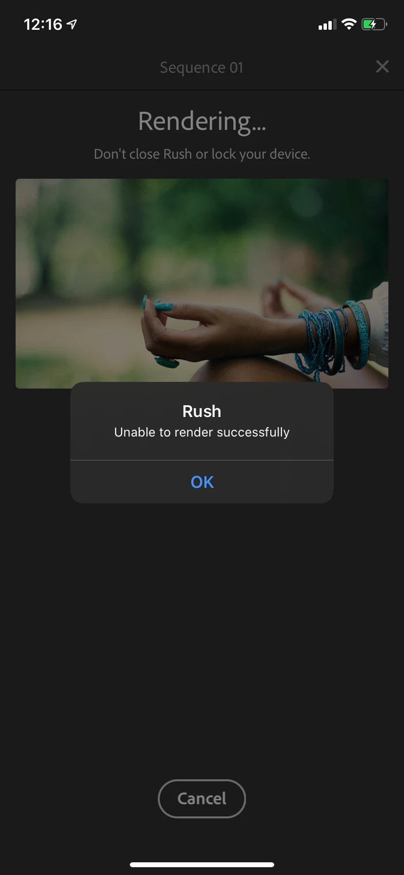 After weeks of using Rush with no problems on my iPad, I suddenly cannot render/export any of my videos, big or small. This started after the most recent automatic update on my iPad Pro a few days ago. I have tried both on my iPad, and my iPhone XR, but I get an instant pop up like this: