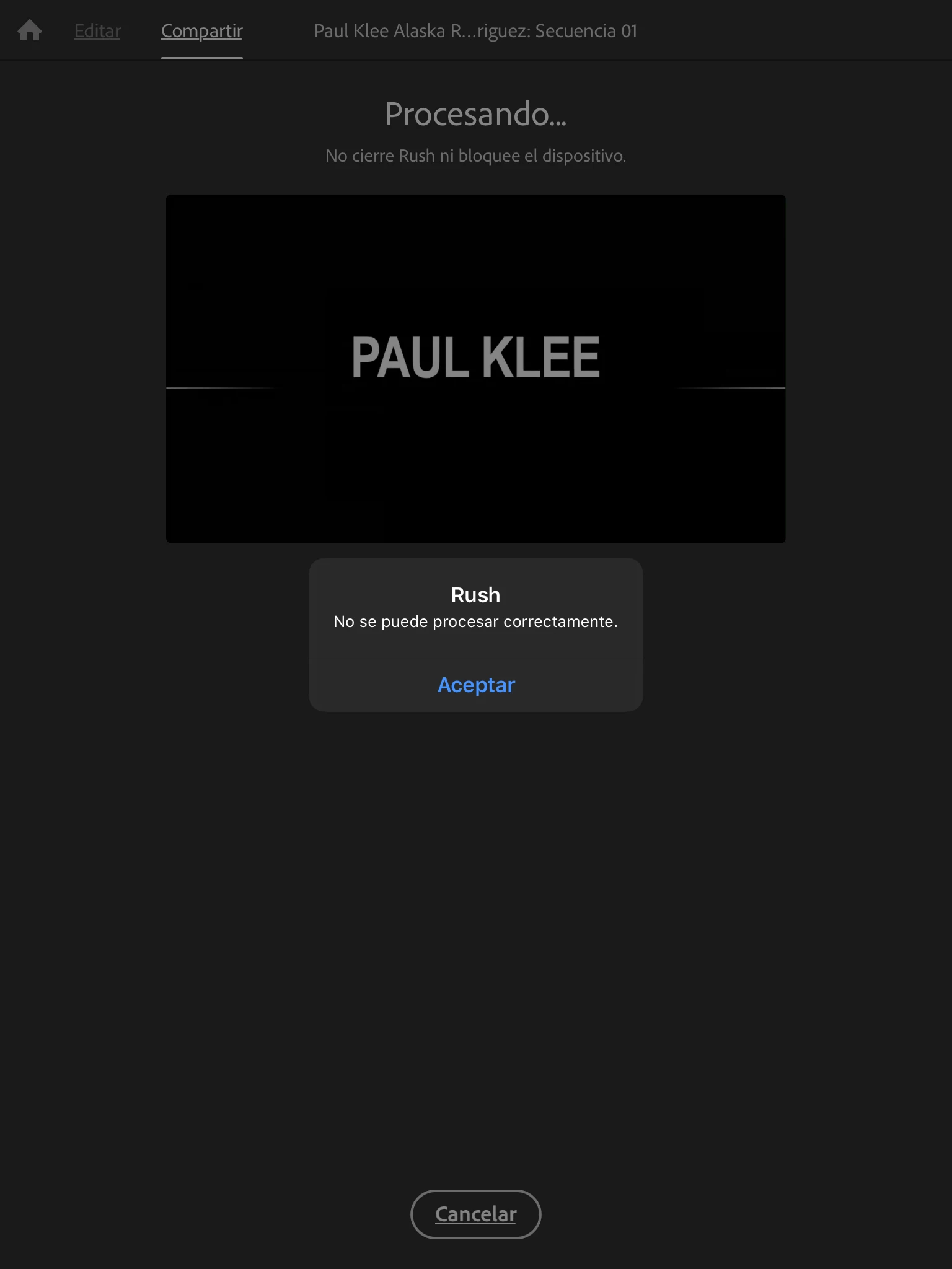 Cuando termine de editar el video en el Premiere Rush de mi IPad, y quise exportarlo, me salió que no se podía. (No se puede procesar correctamente) Por favor ayúdenme, es urgente. Gracias