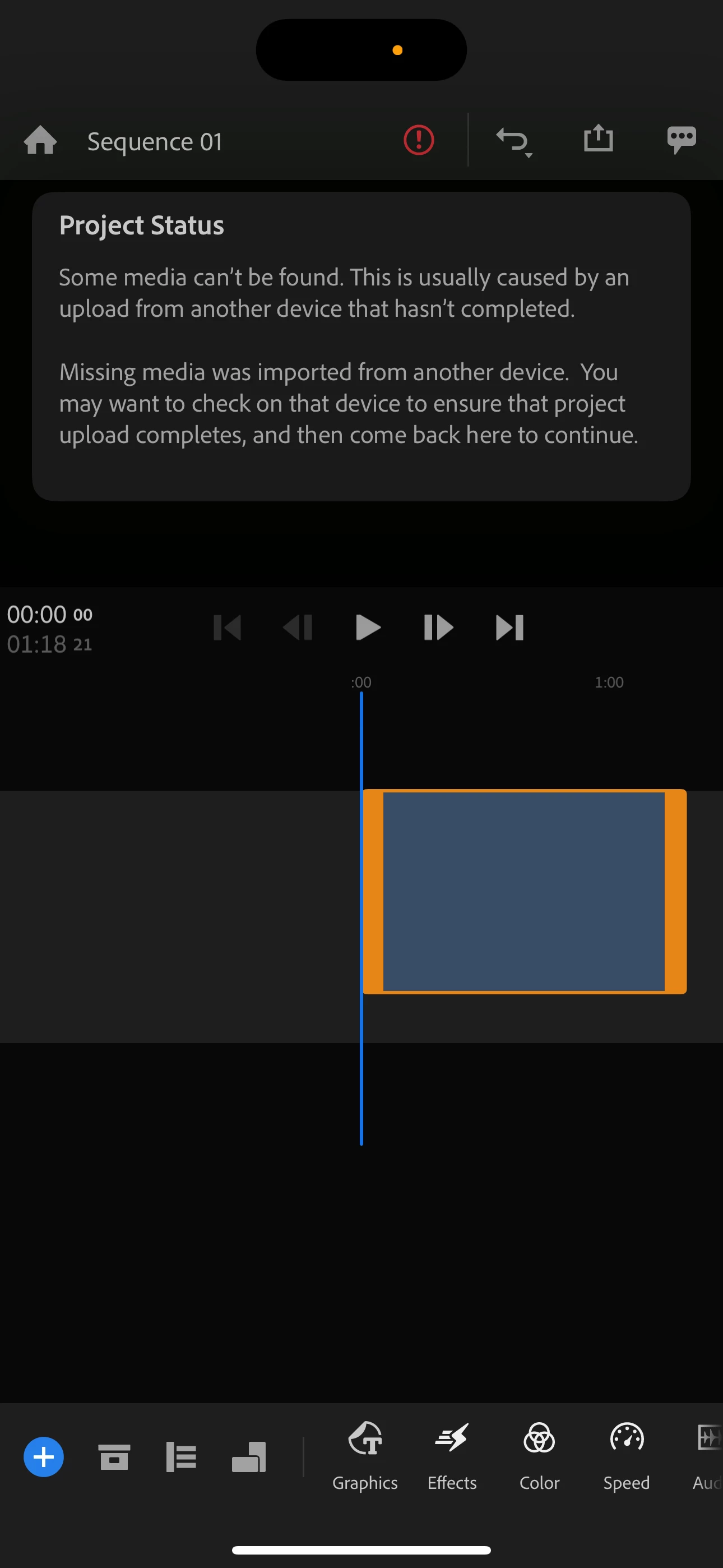 Have received this warning for the same video. I know for a fact that it has completely uploaded from my computer to the cloud so I am confused why it will not load in my phone. Have this problem before with multiple videso. Have checked my connections to the internet. I can upload photos and videos from Lightroom just fine but premier Rush won't work on any of my devices.