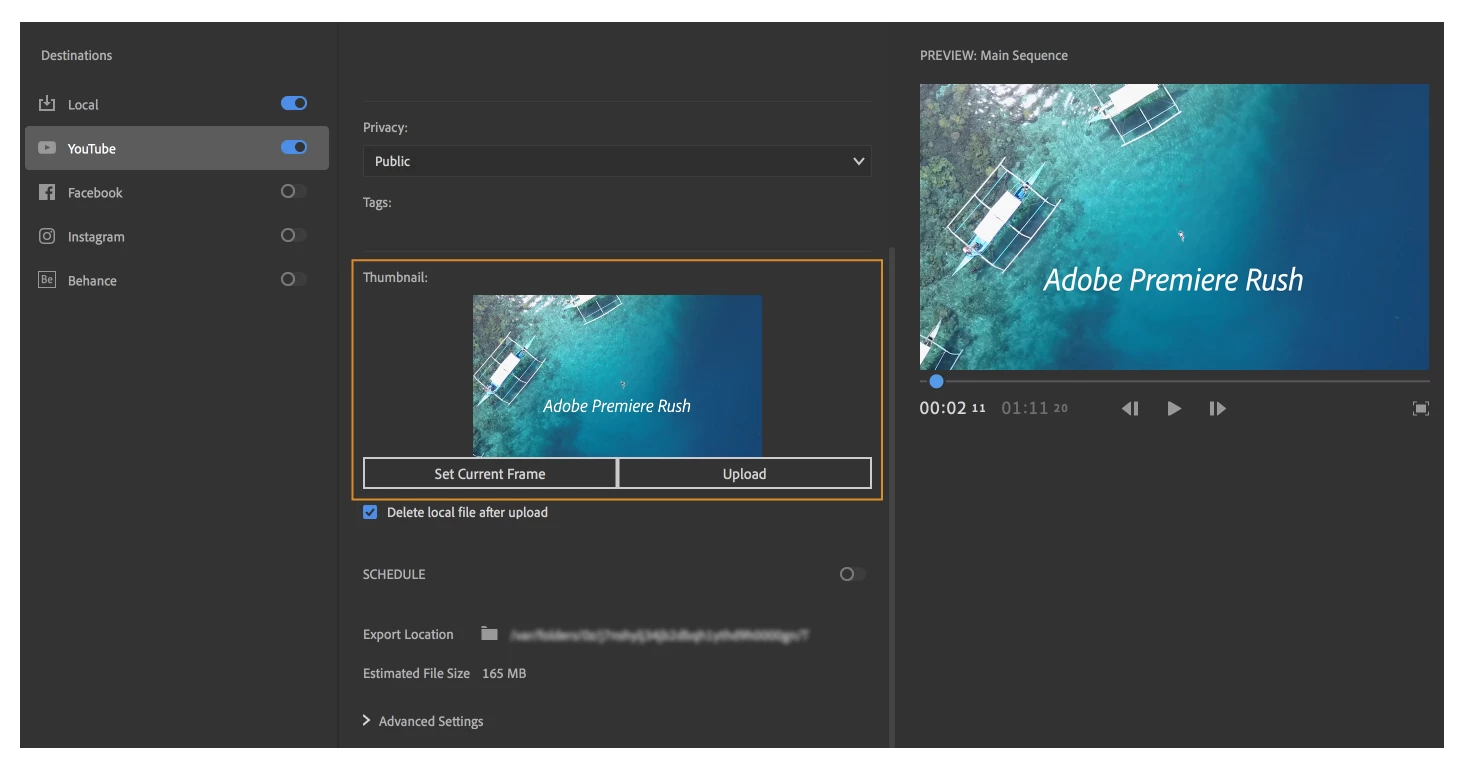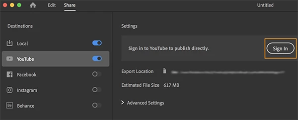 You can sign in to YouTube from Premiere Rush and directly share your video on your YouTube channel.