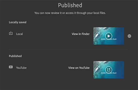 - After Premiere Rush completes rendering successfully, your video is ready to be published on YouTube. Click Publish. Premiere Rush publishes the video directly to YouTube and notifies you when publishing is completed.