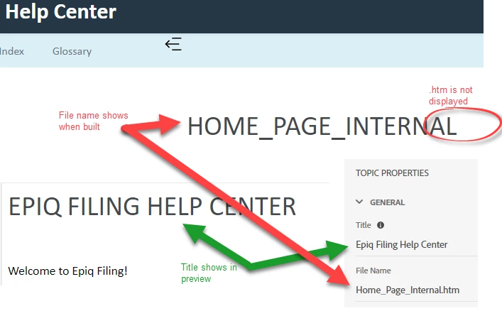 This seems related to RH-11277 but not the same. On every page the Title is displayed when I preview the page. When I build the output the file name is shown on every page. The file name is without the .htm which is odd. See image below.