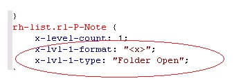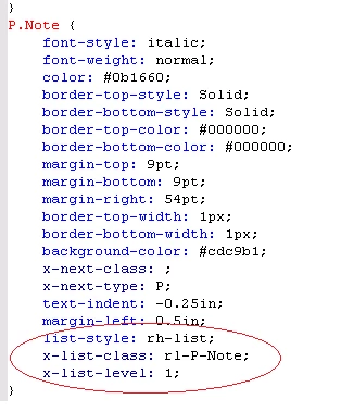 When you view the CSS code, the three circled lines on the left are added to the p.Notes style. In addition, the rt-list.rl-P-Note style is created, showing the formatting for the bullet/icon: