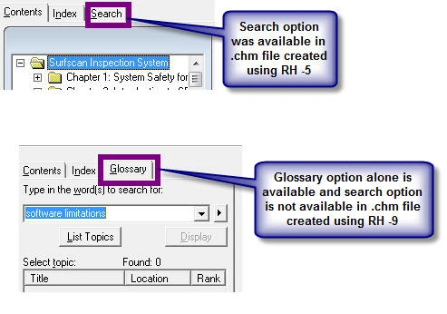All these days, I was using RH -5 to create the .chm file. Today, I moved onto RH -9. The chm file had the Search option enabled automatically in RH-5. But in RH-9, Glossary option alone is available and I am not able to add Search tab adjacent to the Index tab. Please refer to the screenshot for more clarification.
